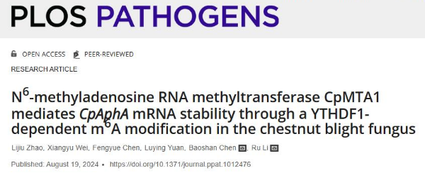 近日,我院李茹团队在国际权威学术期刊PloS Pathogens上发表了题为“N6-methyladenosine RNA methyltransferase CpMTA1 mediates CpAphA mRNA stability through a YTHDF1-dependent m6A modification in the chestnut blight fungus”的研究论文,鉴定了植物病原真菌中的m6A甲基转移酶CpMTA1在真菌生长发育和致病力中发挥重要作用,并揭示了CpMTA1通过依赖阅读蛋白YTHDF1的m6A修饰调控磷酸酶CpAphA mRNA的稳定性。