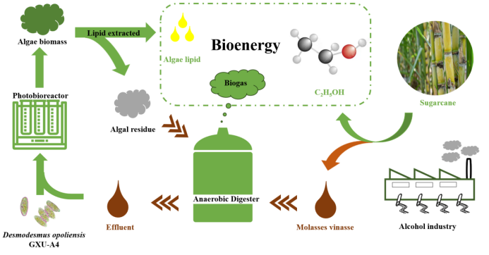 以上研究成功构建了一个糖蜜酒精废水资源和微藻生物能源开发利用的循环新策略(图4)。