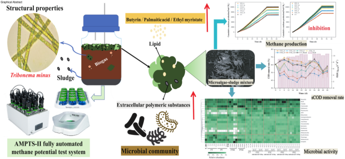 在《Journal of Cleaner Production》研究成果中,比较了脂质提取前后的小黄丝藻(Tribonema minus)对糖蜜酒精废水厌氧共消化的影响,在液体厌氧消化环境中,由于沉降性不同,颗粒污泥往往会处于反应器的底部,导致甲烷、二氧化碳等气体是由反应器底部产生,上升的气体会导致黄丝藻聚合体夹杂颗粒污泥上浮,而且黄丝藻的添加会提高反应器中的脂质含量,降低了消化液表面张力,导致沼气气泡可能会被截留在液面并诱发泡。有趣的是,发现黄丝藻进行脱脂处理能够有效避免这种现象,脱脂后的黄丝藻可作为一种良好的厌氧共消化基质,促进甲烷的产生(图1)。