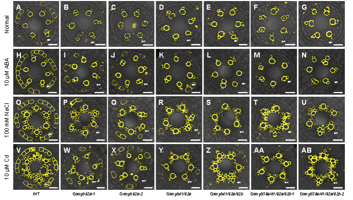 图2在正常和胁迫条件下对野生型和Osmybs突变体根内皮层木栓质累积的观察