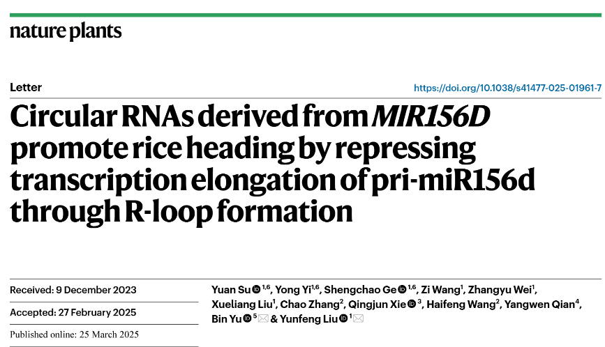 近日,我院刘云峰教授团队在环形RNA调控水稻开花领域取得新进展,相关研究成果以“The circularRNAs derived from MIR156D promote rice heading by repressing transcription elongation of pri-miR156d through R-loop formation”为题,发表在Nature子刊Nature Plants上。该论文的共同第一作者为广西大学生命科学与技术学院苏元副教授、2021级生物学博士生易勇和葛盛超副教授,通讯作者为我院刘云峰教授和美国内布拉斯加大学林肯分校于彬教授。广西大学为论文第一完成单位。