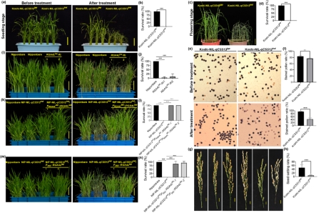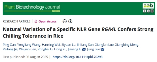 2025年8月6日,广西大学罗继景教授课题组及崖州湾国家实验室李家洋院士团队合作研究论文“Natural variation of a specific NLR gene RGA4L confers strong chilling tolerance in rice”在国际知名杂志Plant Biotechnology Journal在线发表。该研究成功从粳稻品种Koshihikari(越光)克隆了高效应的水稻耐冷性基因Disease Resistance Gene Analog 4-Like(RGA4L),该基因编码一个特异调控非生物胁迫抗性的NLR蛋白,可显著提高水稻苗期、分蘖期和开花期的耐冷性;同时该研究揭示了RGA4L通过与OsHSP90和OsLEA5的相互作用共同调控水稻耐冷。将RGA4Ljap导入不同籼稻品种(NJ11/HHZ/556)时,可以在提高水稻耐冷性的同时对产量不产生不良影响。这一重要发现不仅丰富了水稻耐冷的调控网络,完善了相关理论体系,更为水稻低温抗性育种提供了宝贵的基因资源,对低温胁迫下稳定水稻产量有重要意义。