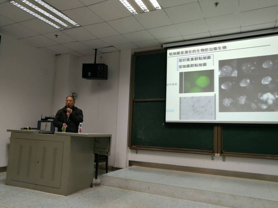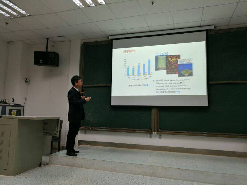 “南农名师西大行”专场学术报告会是南京农业大学生命科学学院与广西大学生命科学与技术与学院签订对口合作协议后的首场学术交流活动。全国教学名师强胜教授的主题报告是“杂草——人类发展的绊脚石”,讲述了人类发展与杂草的关系、杂草如何影响粮食作物的生长以及如何解决杂草对粮食作物生长的影响。崔中利教授的主题报告“捕食性粘细菌资源分离及珊瑚球菌EGB抗稻瘟病机制研究”,针对影响水稻生长的“顽固分子”----稻瘟病,筛选出了对稻瘟病具有较强拮抗作用的粘细菌,研究其抗病机制及相关的代谢调控途径。崔瑾教授介绍了当前我国高校虚拟仿真教学的发展状况,以及南京农业大学生命科学学院“农业与生物类虚拟仿真教学实验室”的建设情况,鼓励老师同学们积极分享该实验室的教学资源。赵明文教授分享了自己最近几年的科研成果“环境调控灵芝酸生物合成分子机制的研究”,阐述了课题的背景与研究思路,鼓励同学们在科研的道路中,多问几个“为什么”,鞭策自己不断前进。最后,蒋建东教授分享了“化学除草剂的微生物代谢机制与污染修复”,认为杂草的防治不仅要从生态学的角度入手,更要从微生物的角度入手,双管乃至多管齐下才能将来生产生活的需要。
