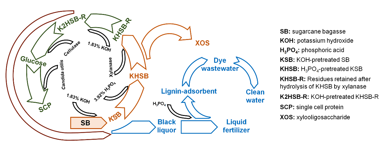 甘蔗是我国主要的糖料作物,广西甘蔗产量位列全国首位。甘蔗渣作为甘蔗榨糖后的副产物,是绿色生物质资源。目前,甘蔗渣主要用作焚烧、造纸等,经济效益低。本研究成果围绕广西甘蔗渣集成生物炼制,通过单因素和响应面分析优化,首次建立了温和酸碱预处理联合丝状真菌植物多糖降解酶水解,以甘蔗渣为原料联产益生元低聚木糖、单细胞蛋白和木质素吸附剂的集成生物炼制绿色工艺,实现了甘蔗渣全组分综合利用。该工艺每100 g甘蔗渣可以生产5.59 g低聚木糖、13.20 g单细胞蛋白和23.84 g木质素吸附剂。这一新的甘蔗渣生物炼制工艺为木质纤维素的绿色应用提供了新的思路。