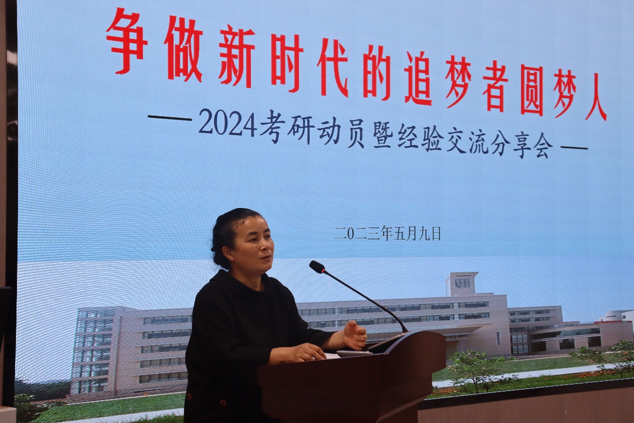 会上,学院党委副书记曾海艳作考研动员,她提出同学们在考研之前要弄清楚四个问题:一是我们为什么要考研;二是考研和就业的关系;三是报考院校、专业、研究生导师的选择;四是如果想考研,那么我们要怎么做?她希望同学们结合自身情况选择目标院校,全身心投入考研,坚定信心、不悔前行。