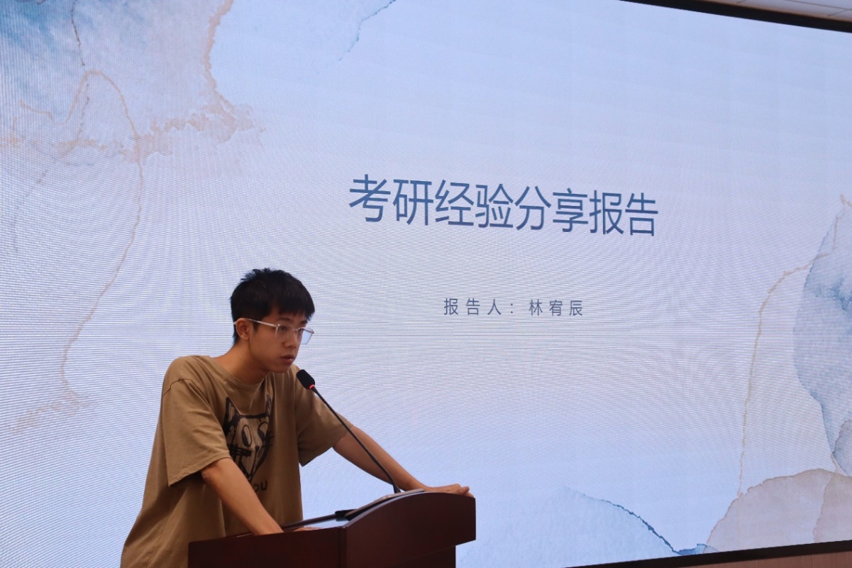 紧接着,学院五位考研成功的2019级本科生分别为大家分享了自己的考研历程与心得体会。林宥辰同学结合自身情况,分享考研前务必要想清楚的事以及备考的方法,谈到考研需要健康的心态。他表示考研唯一不需要考虑的便是考研失败之后应该怎么办,备考的过程中需要很努力才能看起来毫不费力。