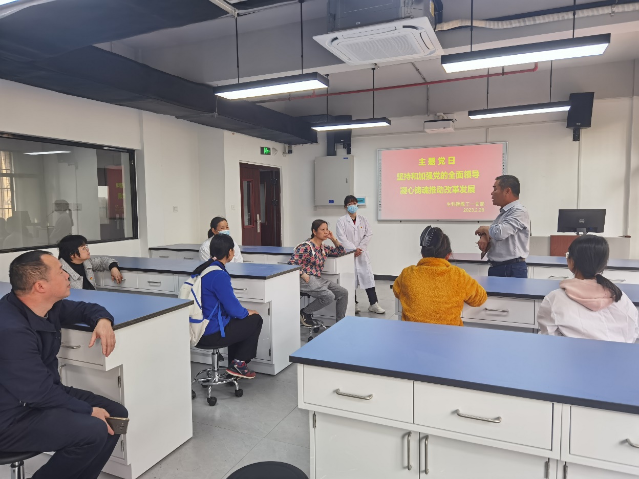 2月28日,教工第一党支部在学院本科教学实验中心召开以“坚持和加强党的全面领导,凝心铸魂推动改革发展”为主题的党日活动。党员同志们首先实地参观了解实验中心正在进行的维修改造一期工程进展情况,然后召开座谈会为实验中心的发展建言献策,纷纷表示要在新学期、在工作岗位上以实际行动践行党的二十大精神。
