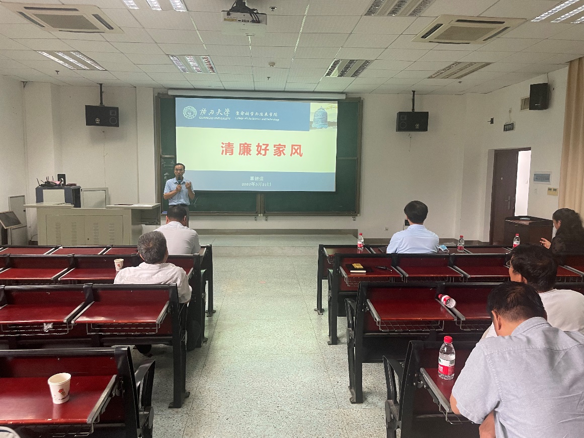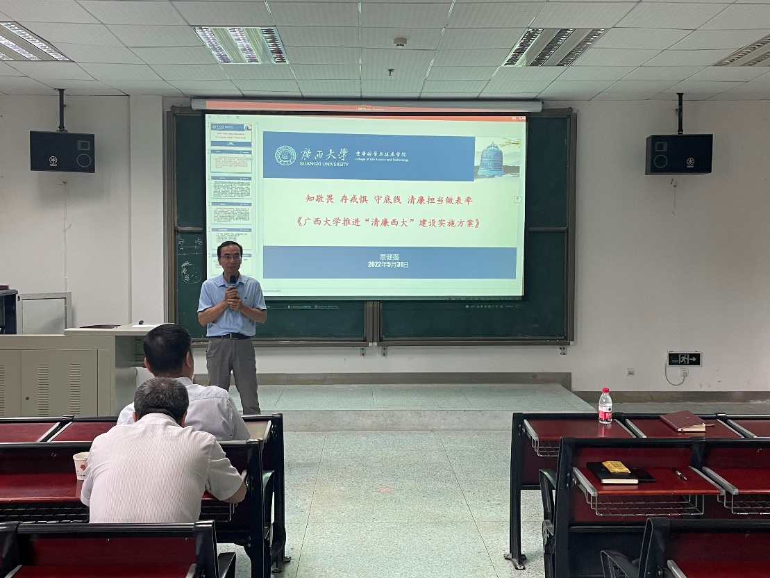 会上,我院党委副书记、纪委书记覃健强向全体教职工传达了《广西大学推进“清廉西大”建设实施方案》文件精神,详细解读了建设方案的指导思想、主要目标、建设任务措施和工作要求,对“清廉学院”建设任务进行了部署。