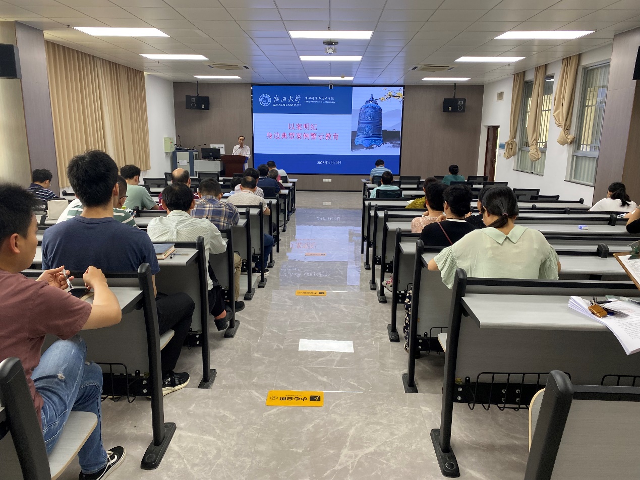 4月19日,我院在南106室召开“以案明纪-身边典型案例警示教育”大会,学院党委副书记、纪委书记覃健强组织全体教职工集中观看廉政警示教育专题片《沉重的忏悔 深刻的警醒》。